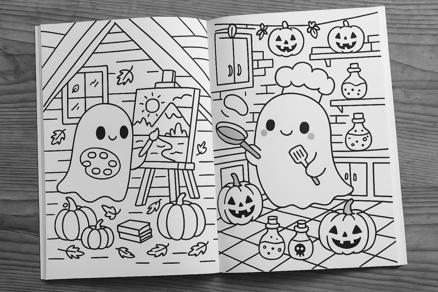👻 49 páginas de adorables fantasmas en diferentes momentos del día listos para ser coloreados. Perfecto para una noche de relajación y creatividad.